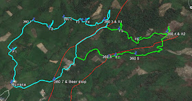 Here is the track for yesterday's HH3 run, For the benefit of the directionally challenged, the two roads in the area are also marked. SH3's (well, Egghead's) habitual runsite on the chicken farm road (rightmost) is at the point where the road crosses the long run (green) at 360 6, the runsite which Shortscrew used for both SH3 and HH3 on the road going up the hill, is at the point where the long and short (blue) runs divided and the stool-chucking runsite is just below where the short run leaves that road. The runs were 6.5 and 4.5k without the F's and X's, 8.2 and 5.3 with them. This probably accounted for why it took the long run about 1hr 15mins to get to the beer stop where they lingered for about 20 minutes. The short run reached it in 45 minutes and moved on quickly, apart from Sex Teacher,who had already done the 10k in Songkhla that morning (along with Geng Curry, who is off the beer and had no reason to hang around) so was feeling the strain, which only 2 beers could relieve. The long run, had they ascended all the upward F's and X's would have taken in a total ascent of around 260m while the short run ascended 100m from the runsite to the 3rd check so must have done a bit more than that altogether. Luk Long lived up to his name and was the only person to become mislaid. In fairness that was because none of the other long runners had been considerate enough to break the 6th 360. Luk Long reached it but then for some reason decided to return to the previous check and was in the process of crossing into the next valley when rescued by the hare and had to be forced to accept a ride back to the beer stop from where he again lost the plot and ended up coming in to the run site from the wrong side. It's in the genes I tell you!